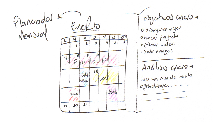 Adicionalmente al inicio de cada mes tengo un espacio donde escribo los objetivos y el análisis del mes, me explico, a principio de mes me planteo unos objetivos y los escribo, esto me ayuda a poder organizar mis semanas de acuerdo a los objetivos. Y luego, al final de mes, hago una análisis donde escribo si cumplí o no los objetivos, como me sentí ese mes creativa, personal y emocionalmente, que aprendí, que cosas buenas o malas sucedieron, etc.