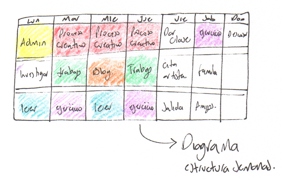 Tip: Algo que yo hago para organizar mejor mi tiempo y mis semanas es tener una especie de diagrama con la división de la semana por tareas que hago habitualmente. Me explico, lo que hago es hacer un esquema de la semana, un calendario como los del colegio, donde están los 7 días de la semana y tres bloque horarios: mañana, tarde y noche. Luego pienso en las cosas que generalmente hago, por ejemplo los lunes en la mañana hago tareas administrativas, los viernes en la tarde investigo, así que con un color marco estas actividades en mi diagrama. Si por ejemplo sabes que los martes y los viernes trabajas en X cosa vas a ir marcando esos días en tu calendario. La idea es dividir la semana en bloques de actividades: primero las que son fijas, luego las que quieres o debes realizar, por ejemplo dedicarle tiempo a un proyecto en específico o a tu proceso creativo y luego si te queda espacio puedes dedicarlo a tareas extras o para salir a divertirte, etc.