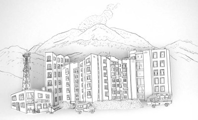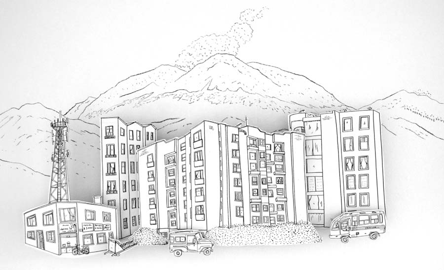Tinta y acrílico sobre madera, carbón sobre pared Dimensiones variables
