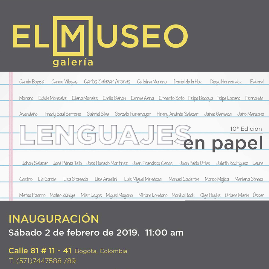 Feria del Millón. Medellín, Colombia. 2021Lenguajes en papel. Galería El Museo. Bogotá D.C, Colombia. 2020 y 2019MECA Art Fair. El Lobi y Taller Malaquita. San Juan, Puerto Rico. 2019A Seis Manos. Galería Otros 360º. Bogotá D.C, Colombia. 2019Feria Arte 10. Foto Museo Cuatro Caminos. Ciudad de México, México. 201821 días en el 621. Residencia Artística en El Lobi. San Juan, Puerto Rico. 2016Diego Mauricio GranadosMentores 10+10. Feria del Millón. Centro Creativo Textura. Bogotá D.C, Colombia. 2016UNA historia SIN MAYÚSCULAS. Exposición Individual. La Esquina Galería. Bogotá D.C, Colombia. 2015La Casa Imaginada. Exposición Individual. Cero Galería. Bogotá D.C, Colombia. 2014Hecho en Casa. Exposición Individual. Cero Galería. Bogotá D.C, Colombia. 2013