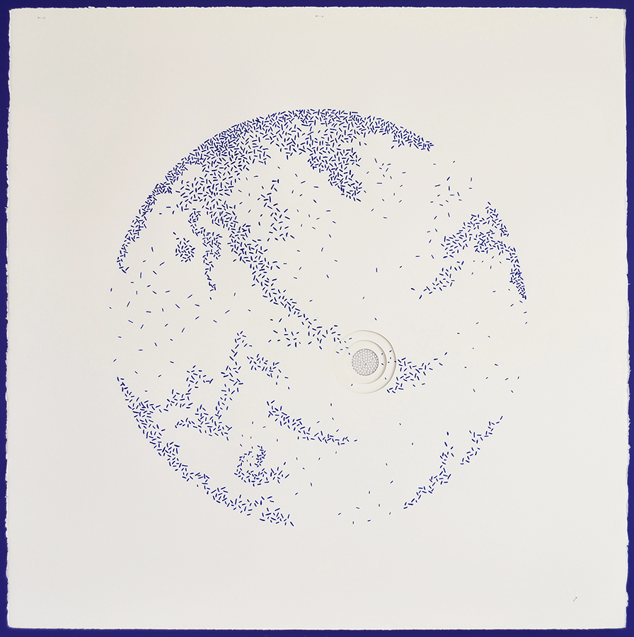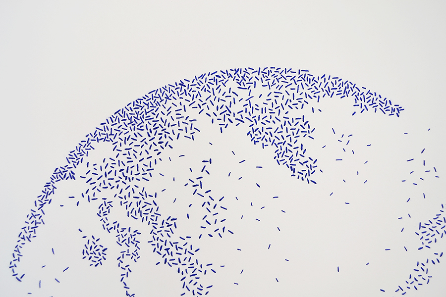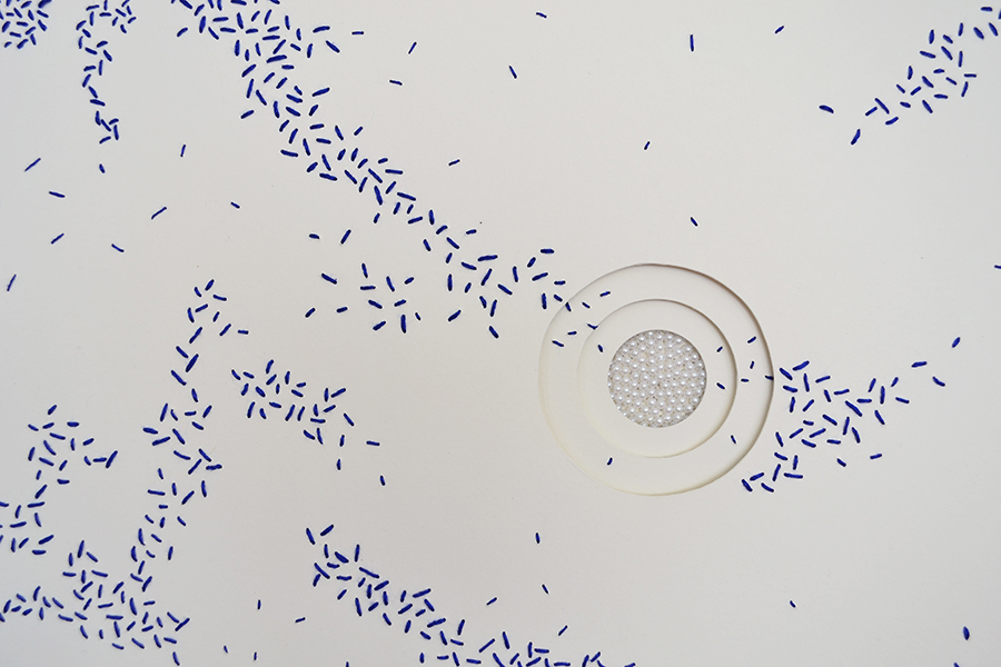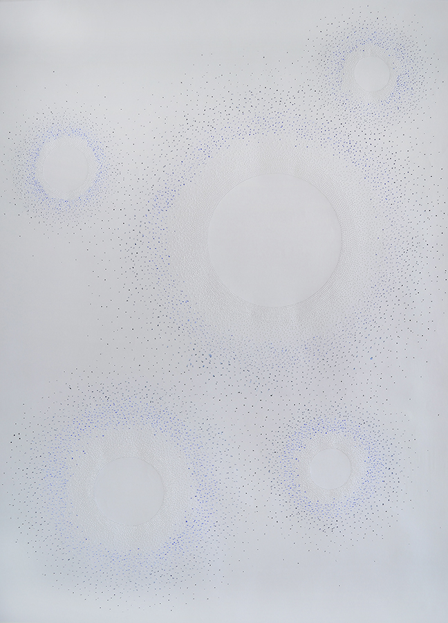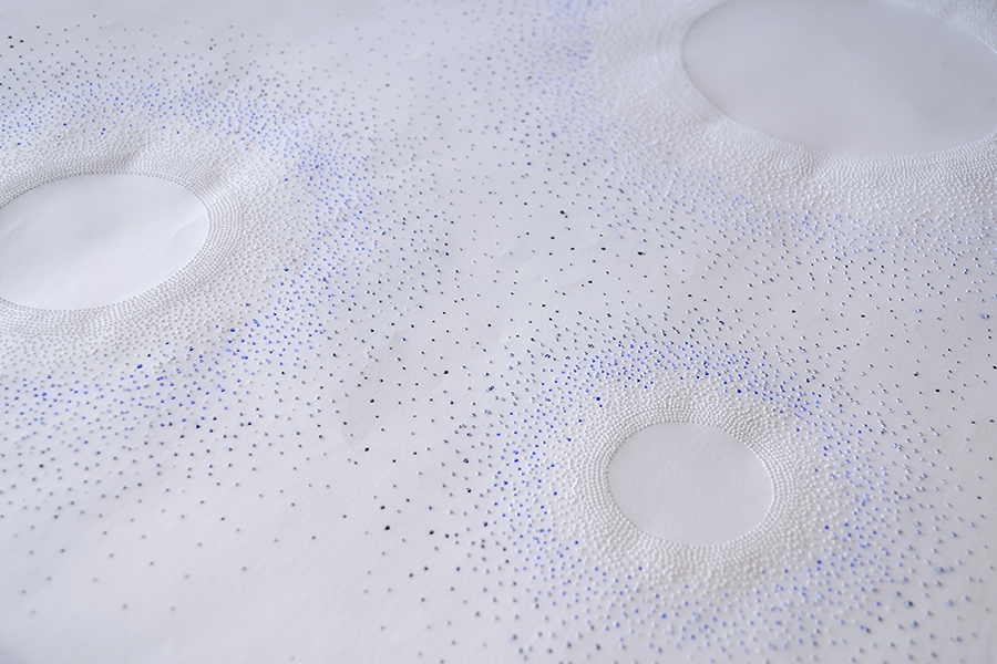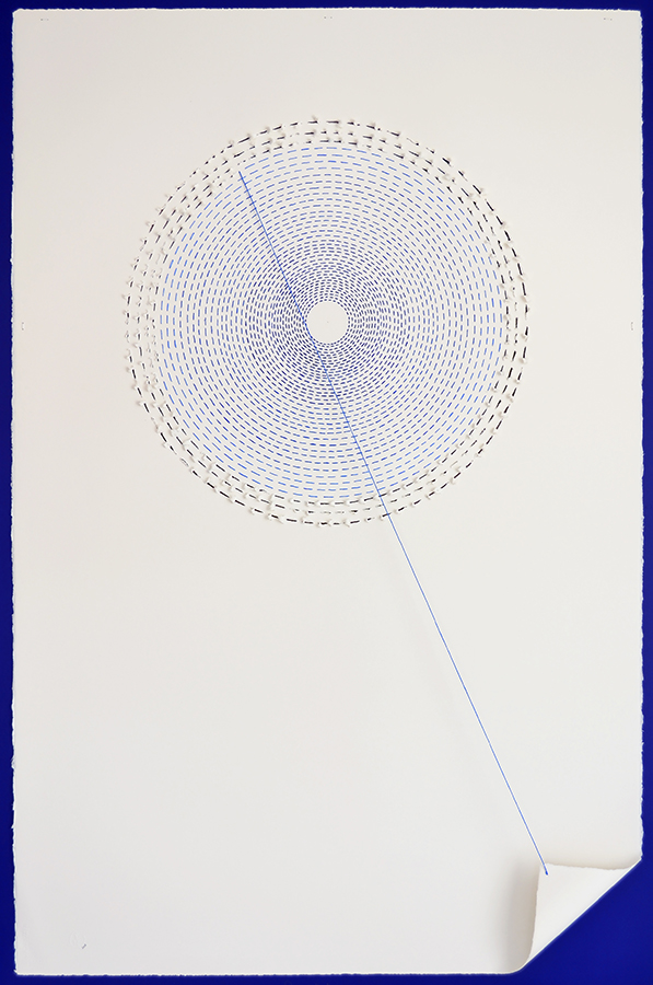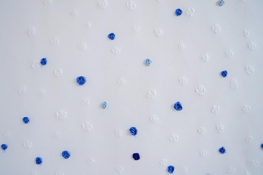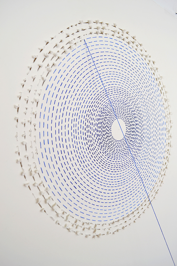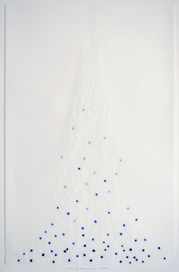 Hace unos años llegó a mis manos el costurero de mi abuela y descubrí algunos bordados que ella estaba haciendo antes de morir, en ese momento se unieron visualmente nuestros mundos, el de la mujer azul: los hilos, la pedrería; y el mío: la línea, el papel y el dibujo.