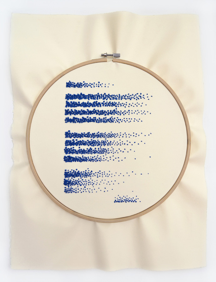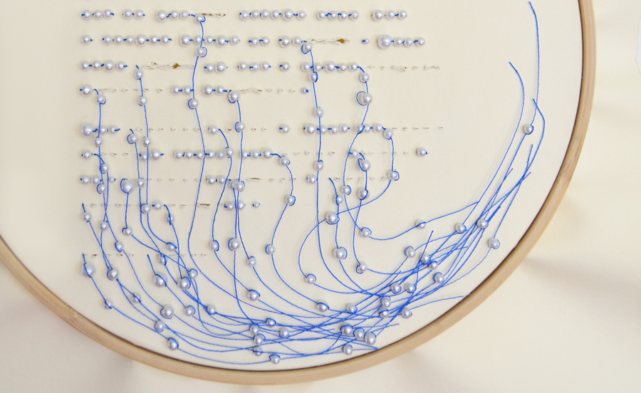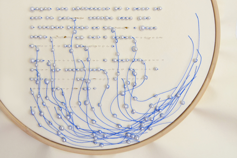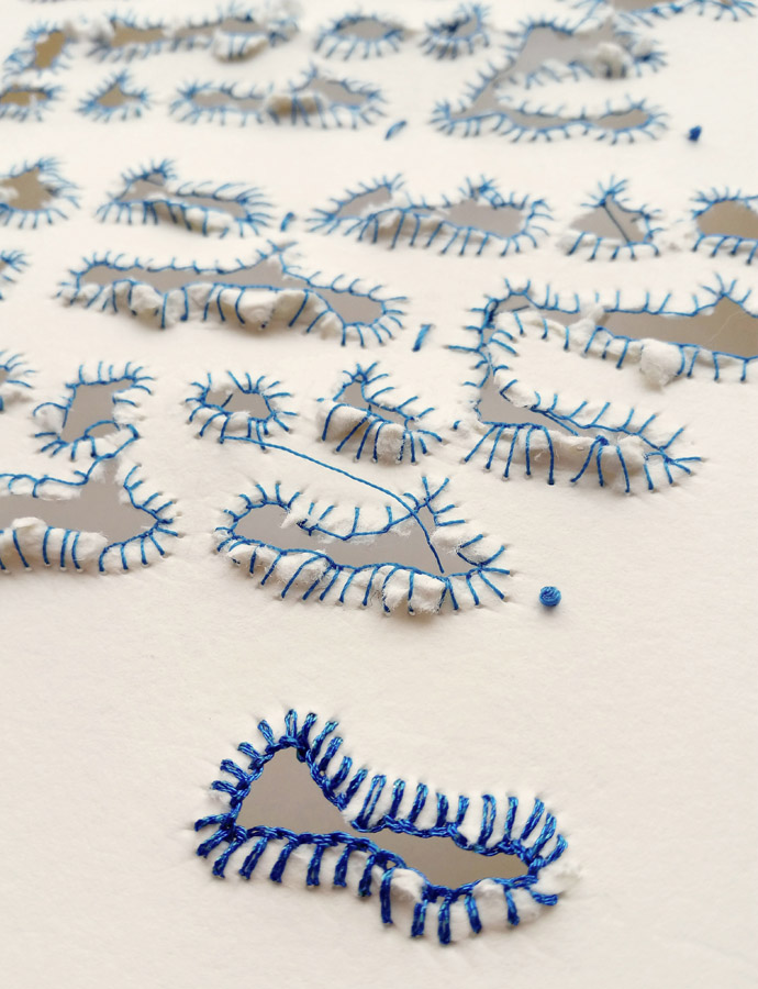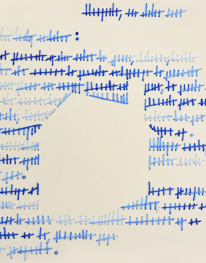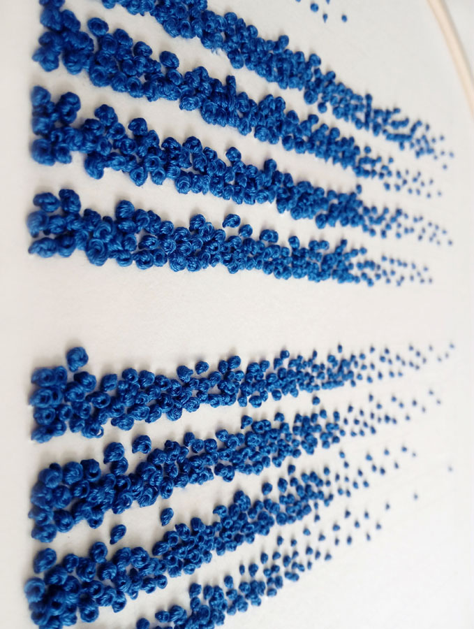 El lenguaje de la mujer azul es el bordado, por lo que esta labor es la guía de la construcción plástica de las piezas. Este proyecto busca unir visualmente dos mundos, el propio: la línea, el dibujo y el papel; y el ajeno: el hilo, la pedrería y el bordado.