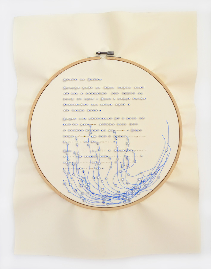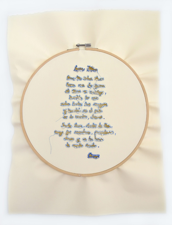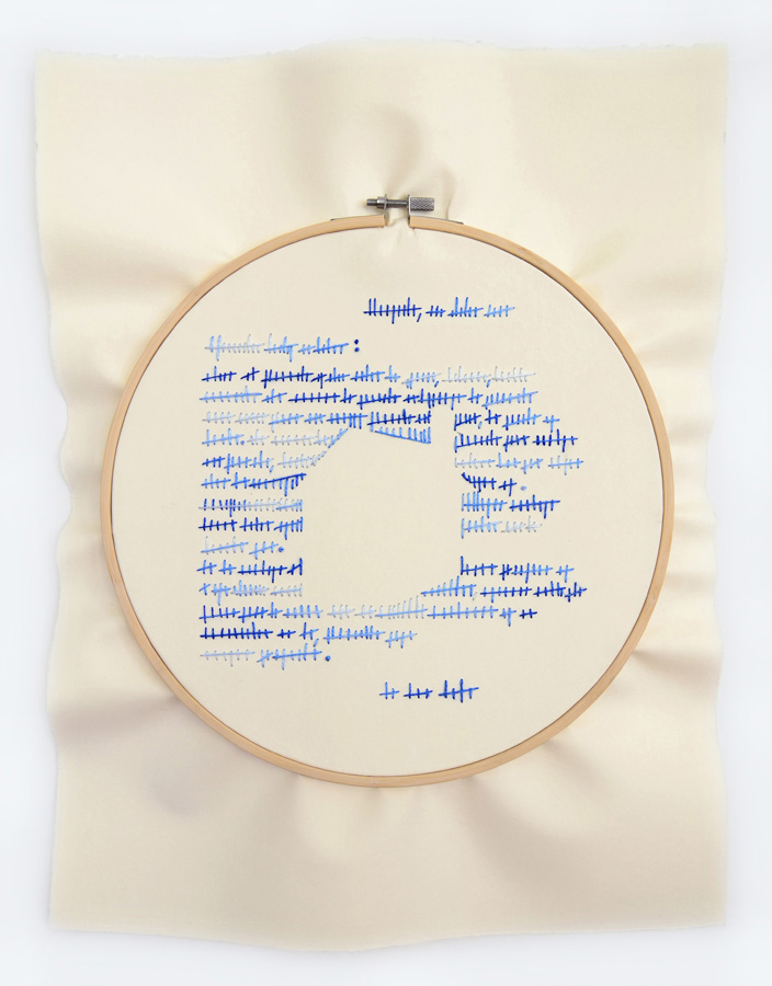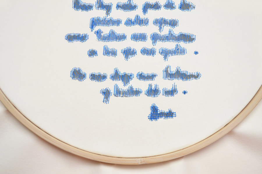 Plegarias de la mujer azul, es una serie de piezas que hacen uso de los elementos del bordado para su realización. El bordado es un oficio meticulosos, dispendioso y repetitivo en su hacer, al igual que las suplicas que realiza a diario la mujer azul. Ella hace plegarias que espera sean escuchadas, palabras rotas y heridas, marcadas por el paso de los días que las convierten en suplicios. Sus oraciones y escritos son la guía para la construcción de estas piezas.
