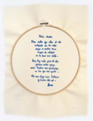 Prayer from the blue lady 6 Bordado en hilo sobre papel templado en tambor de madera 44x34cm 2017